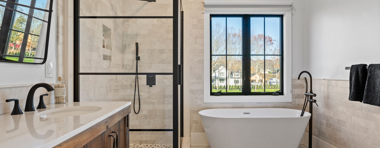Kohler fixtures, custom vanities, and tiled floors and walls.